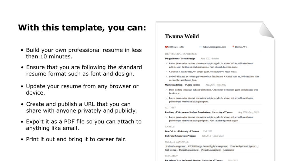 With this template, you can easily create a professional and modern resume in just a few minutes. Simply fill in your personal information, work experience, education, and skills, and you'll have a beautiful and sharable resume in no time. You can even create a unique URL to share your resume with potential employers, or print it out to bring to career fairs and job interviews.